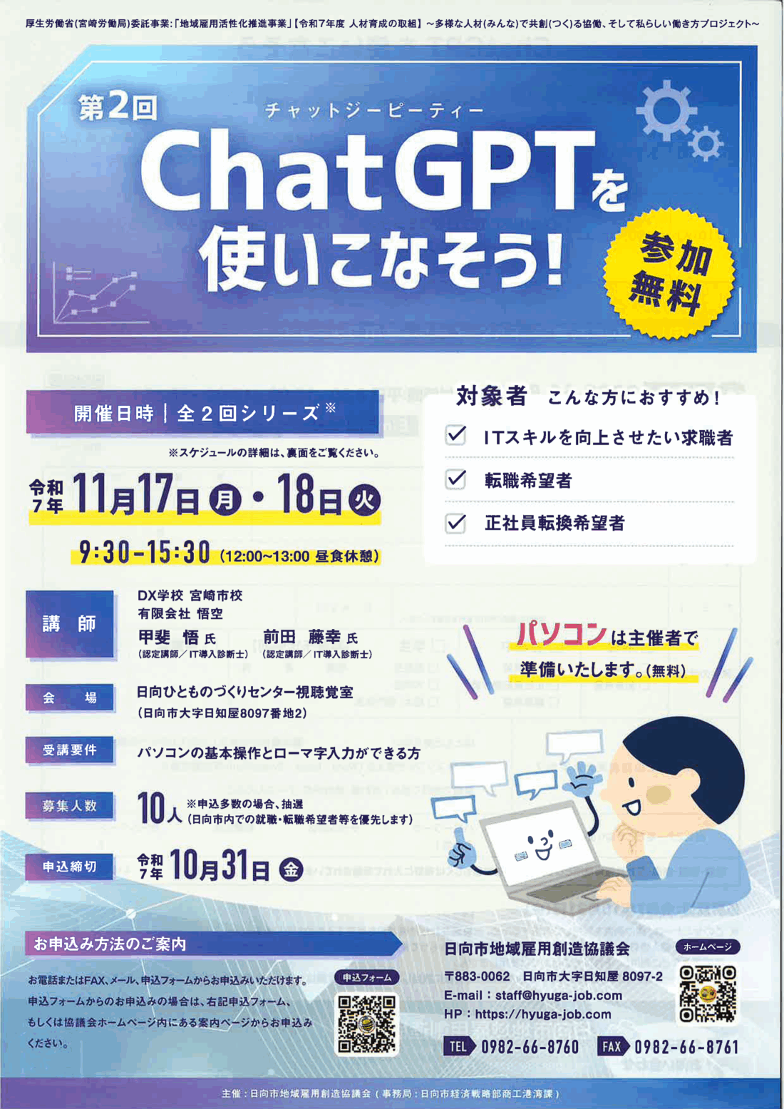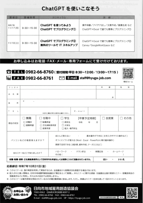 【申込方法】下記の申込フォーム、電話、または、参加申込書に必要事項を記入のうえ、FAX・メールでも受け付けております。申込後3日以内(土日祝日を除く)に電話またはメールで受付確認のご連絡をさせていただきます。3日を過ぎてもご連絡がない場合はお手数ですが日向市地域雇用創造協議会にご連絡いただきますようお願いいたします。