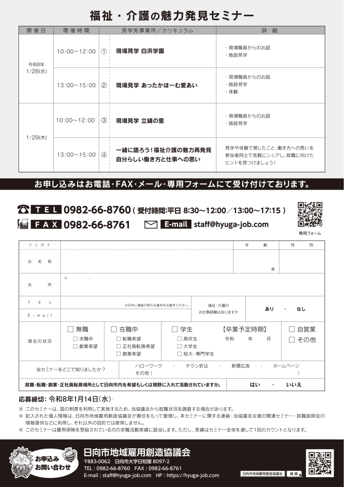 【申込方法】下記の申込フォーム、電話、または、参加申込書に必要事項を記入のうえ、FAX・メールでも受け付けております。申込後3日以内(土日祝日を除く)に電話またはメールで受付確認のご連絡をさせていただきます。3日を過ぎてもご連絡がない場合はお手数ですが日向市地域雇用創造協議会にご連絡いただきますようお願いいたします。